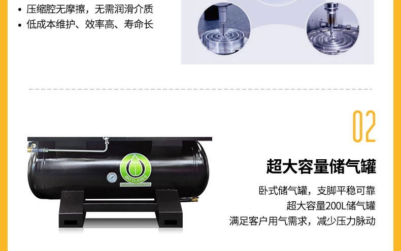葆德渦旋式空壓機特點:220V/380V電壓可選,主機耐高壓、噪音低,振動小、節能穩定,可24小時連續運轉,無人值守自動化排水,型號:BD-4VW、BD-6VW、BD-10VW