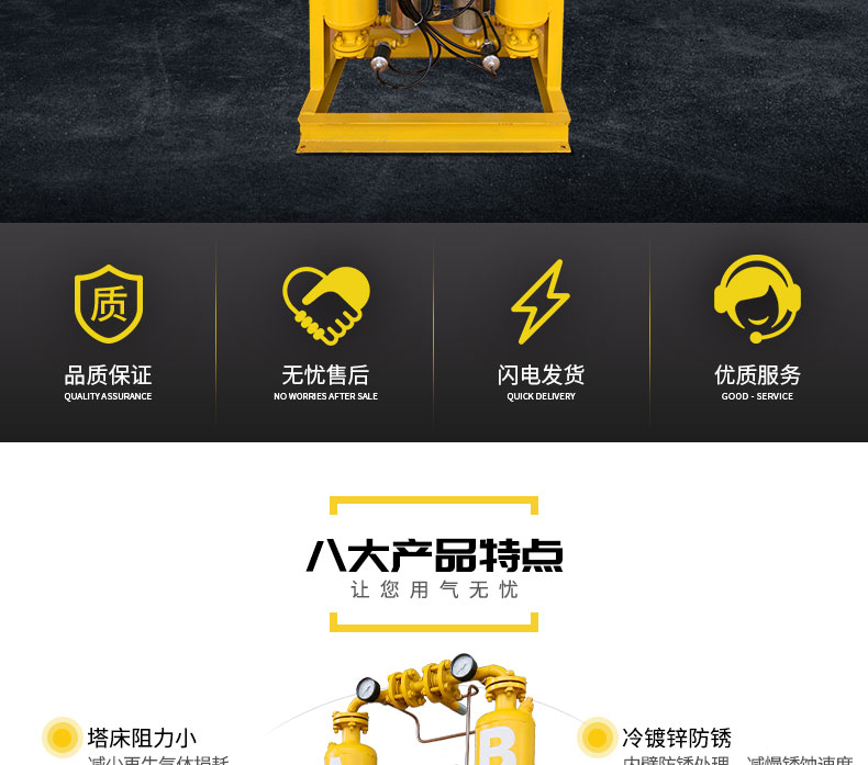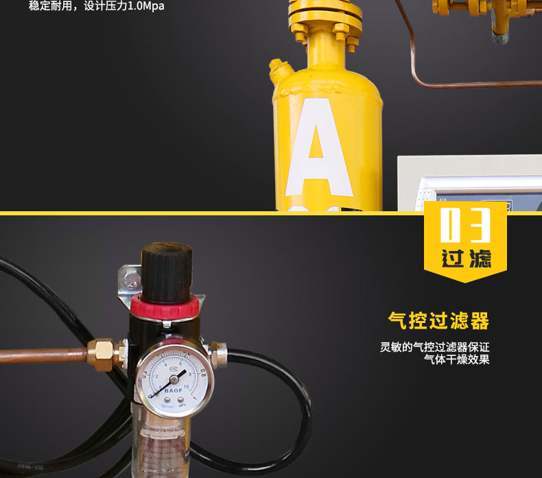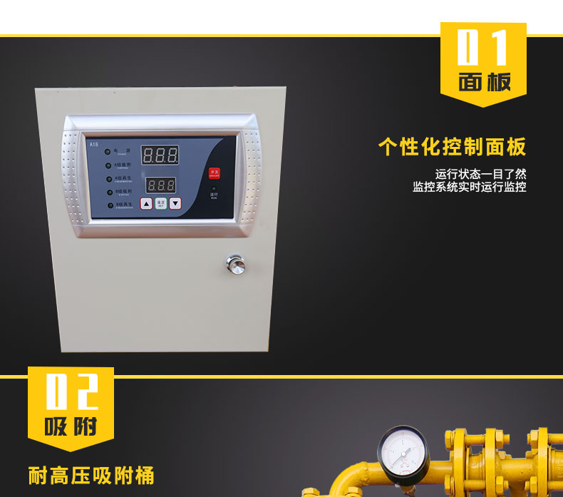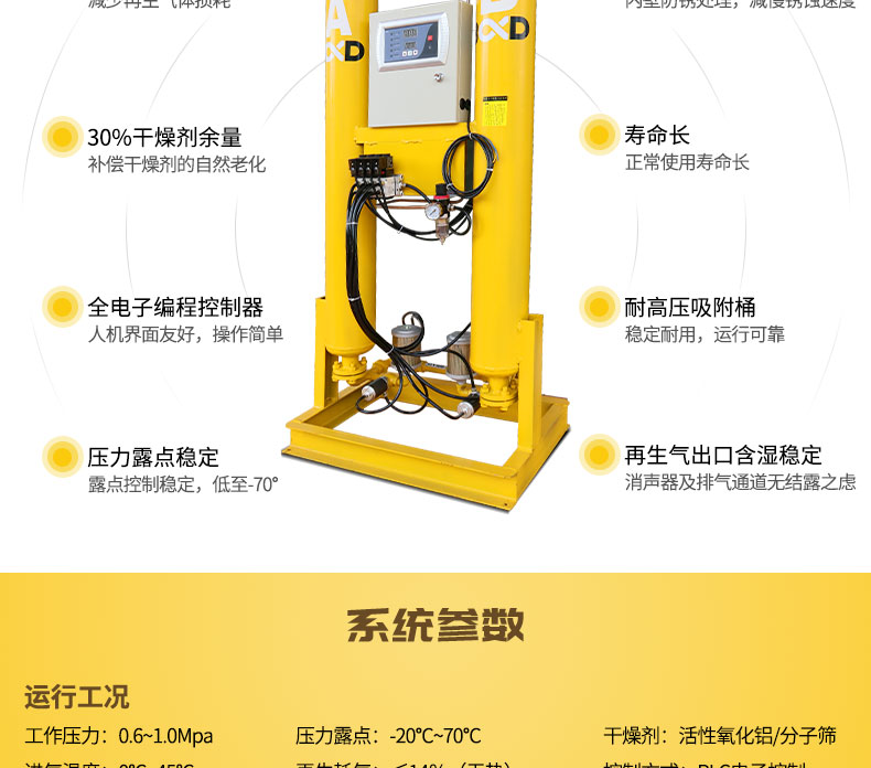 塔床阻力小,減少再生氣體損耗 冷鍍鋅防銹,內(nèi)壁防銹處理,減慢銹蝕速度 30%干燥劑余量,補償干燥劑的自然老化 全電子編程控制器,人機界面友好、操作簡單 耐高壓吸附桶,穩(wěn)定耐用